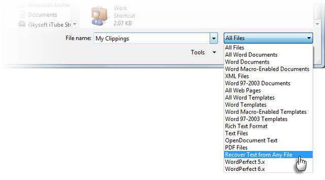 dan ambil command “Recover Text from Any File” dari daftar tipe file (kanan
